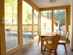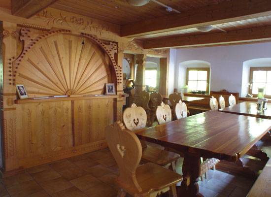 Unser oberer, gemütlicher Essraum ist mit kunstvollen Schnitzereien aus dem Tatra-Gebiet versehen, die das Herz des Hauses zu einem besonders gemütlichen Ort der Begegnung machen. Im unteren Essraum finden mehr Gäste Platz. Der direkte Zugang zum Garten lädt nach dem Essen zu Spaziergängen ein.